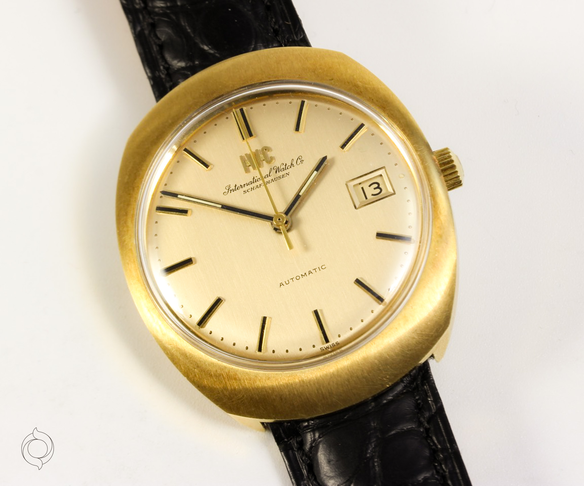 Unbehandelt original gold, aufgelegte Indexe mit Onyx un IWC Logo, Leucht-Stundenpunkte, Lanzenzeiger mit Onyx und Leuchtmittel, Minutenpunkte, Datum, Zentralsekunde