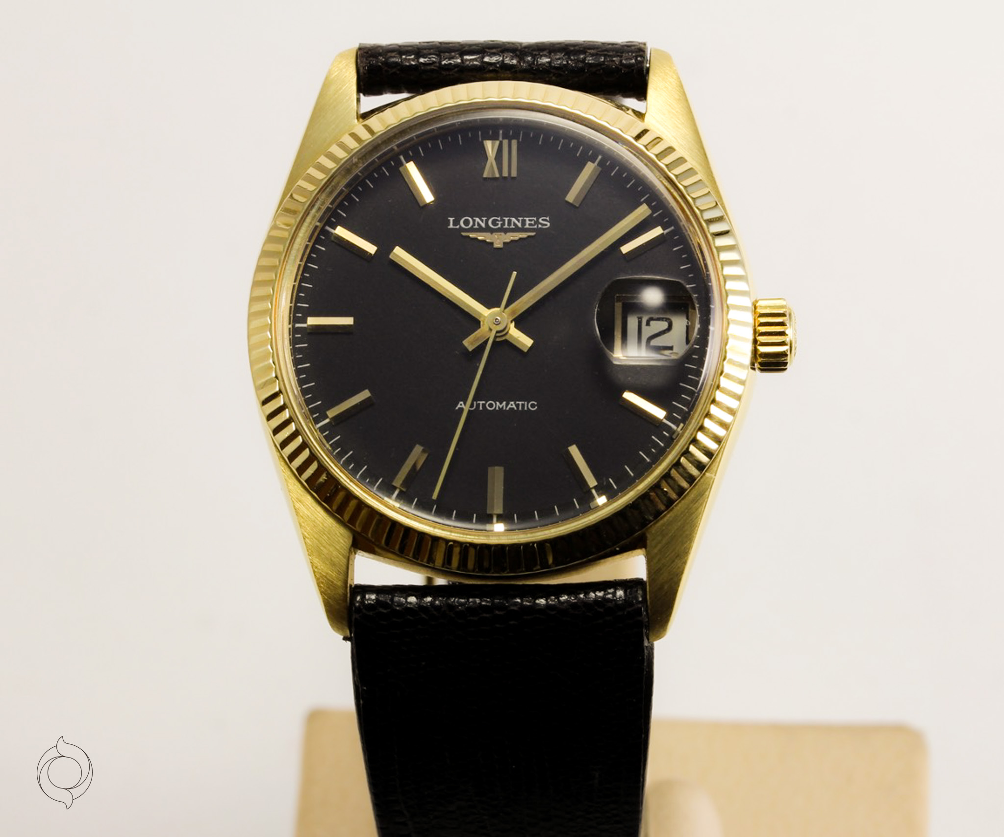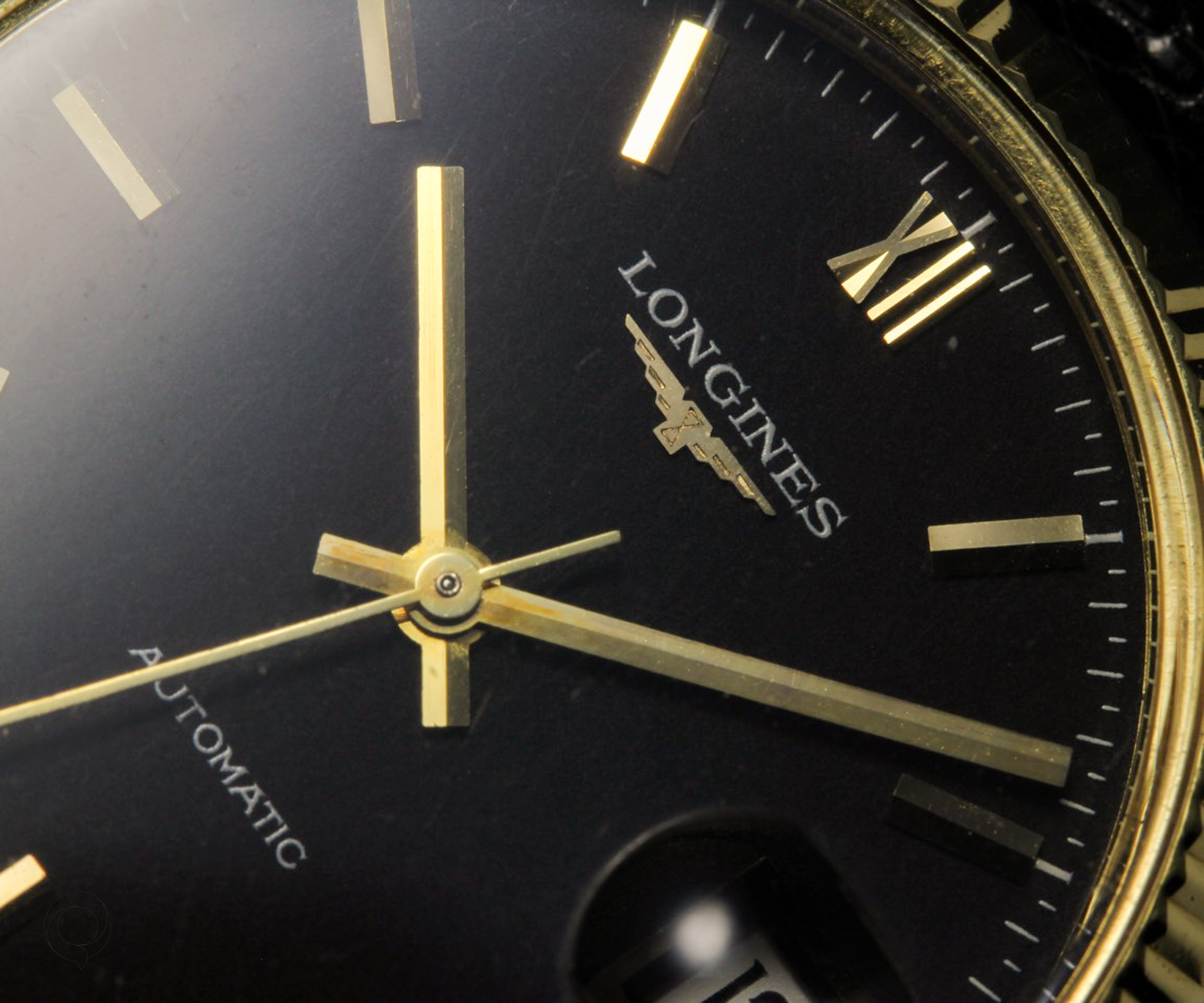 Unbehandelt original schwarz, aufgelegte römische 12, Indizes und Longines Logo, Baton Zeiger, Minuterie, Datum mit Lupe, Zentralsekunde