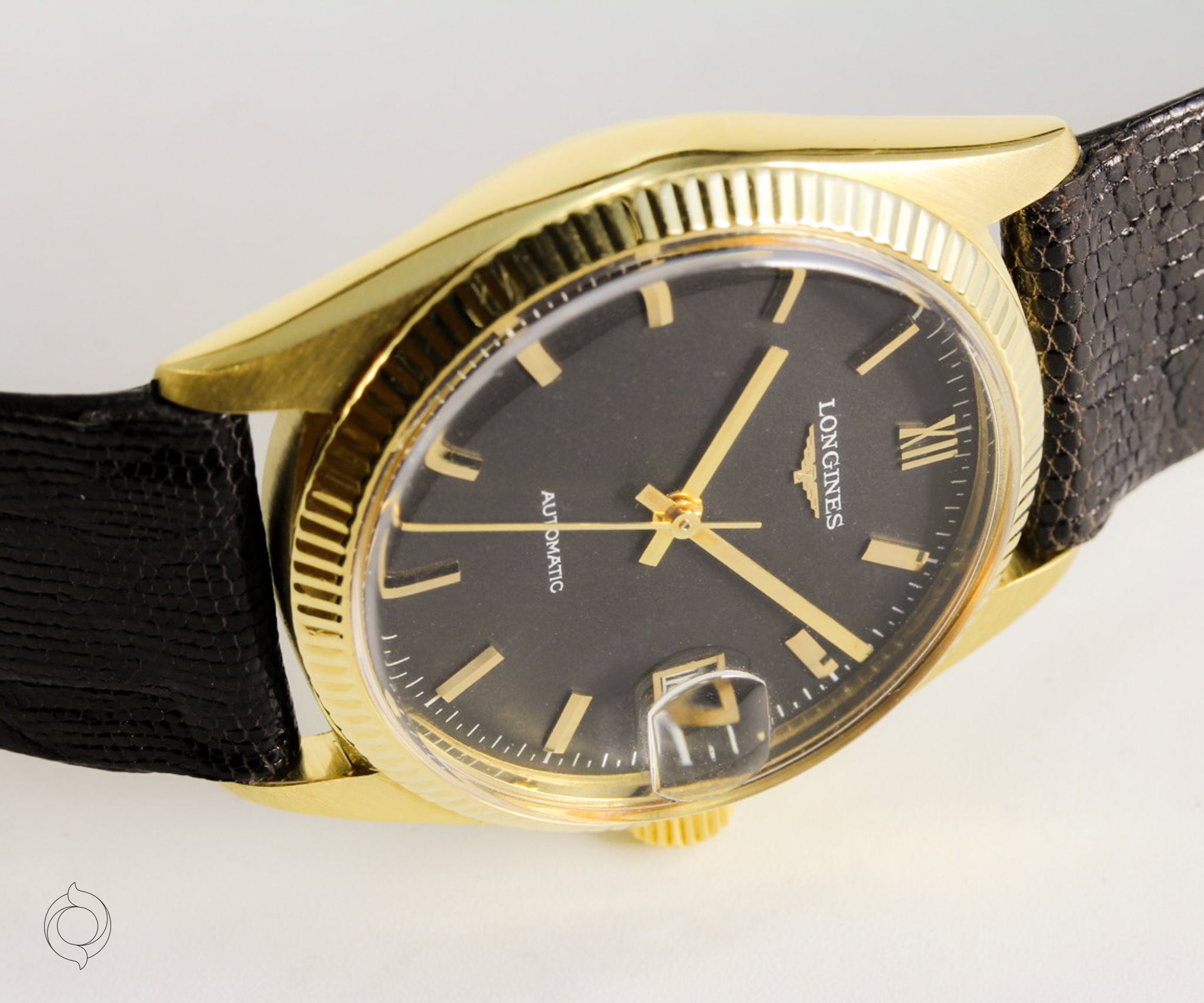 Seltene LONGINES Anzuguhr 18K Gold Gehäuse, geschraubter Boden, geriffelte Lünette, Gewicht 47 g, Automatik Kal. 633, Herstellung 1978, schwarzes Zifferblatt, unbehandelt original exzellent erhalten, mit vergoldeter LONGINES Schließe und Original Archivauszug von LONGINES! Zifferblatt, Gehäuse, Werk, Krone und Schließe sind LONGINES signiert Zubehör: GARANTIEKARTE, LONGINES Archivauszug, Dokumentation und SCHÖNE SAMMLERUHREN Uhrenbox