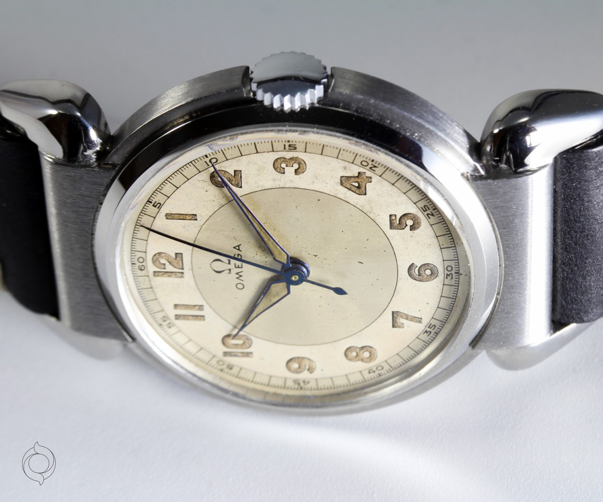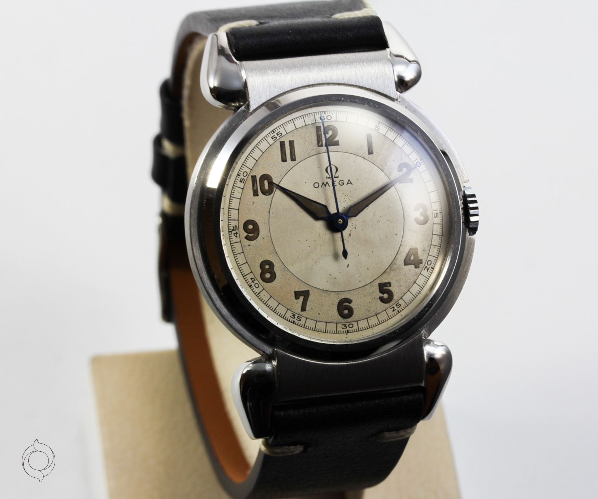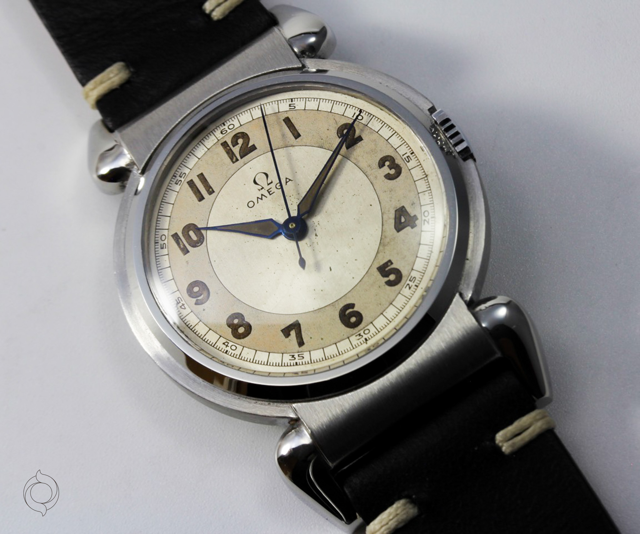 Extravagante frühe OMEGA Anzuguhr großes Edelstahl Gehäuse mit spektakulären Bandanstöße (Scarab Lugs), frühes Kaliber 26.5, two-tone Zifferblatt, Herstellung 1939, unbehandelt original sehr gut erhalten! Zifferblatt, Gehäuse und Werk sind OMEGA signiert Zubehör: GARANTIEKARTE, SCHÖNE SAMMLERUHREN Echtheitszertifikat, Dokumentation und SCHÖNE SAMMLERUHREN Uhrenbox
