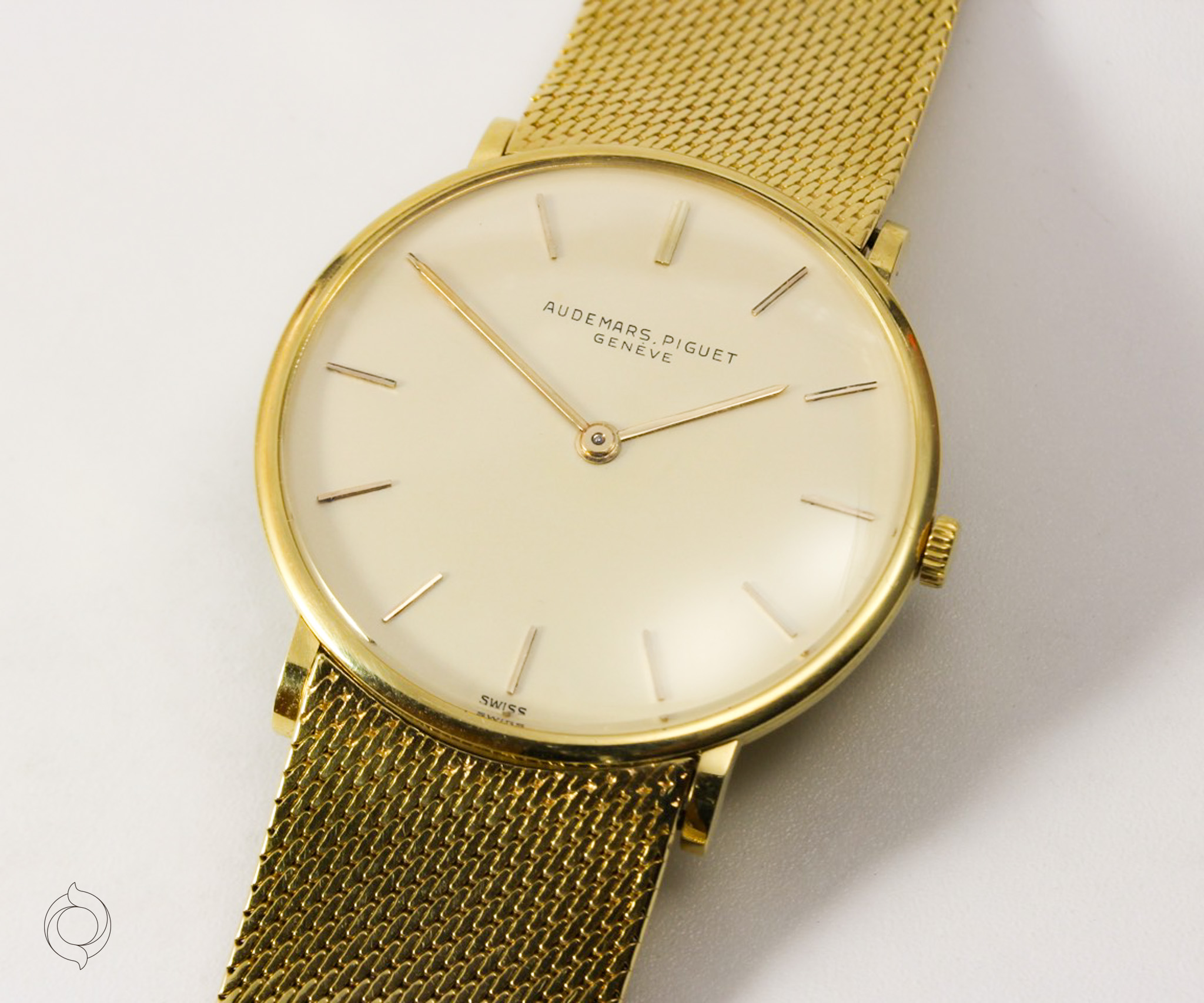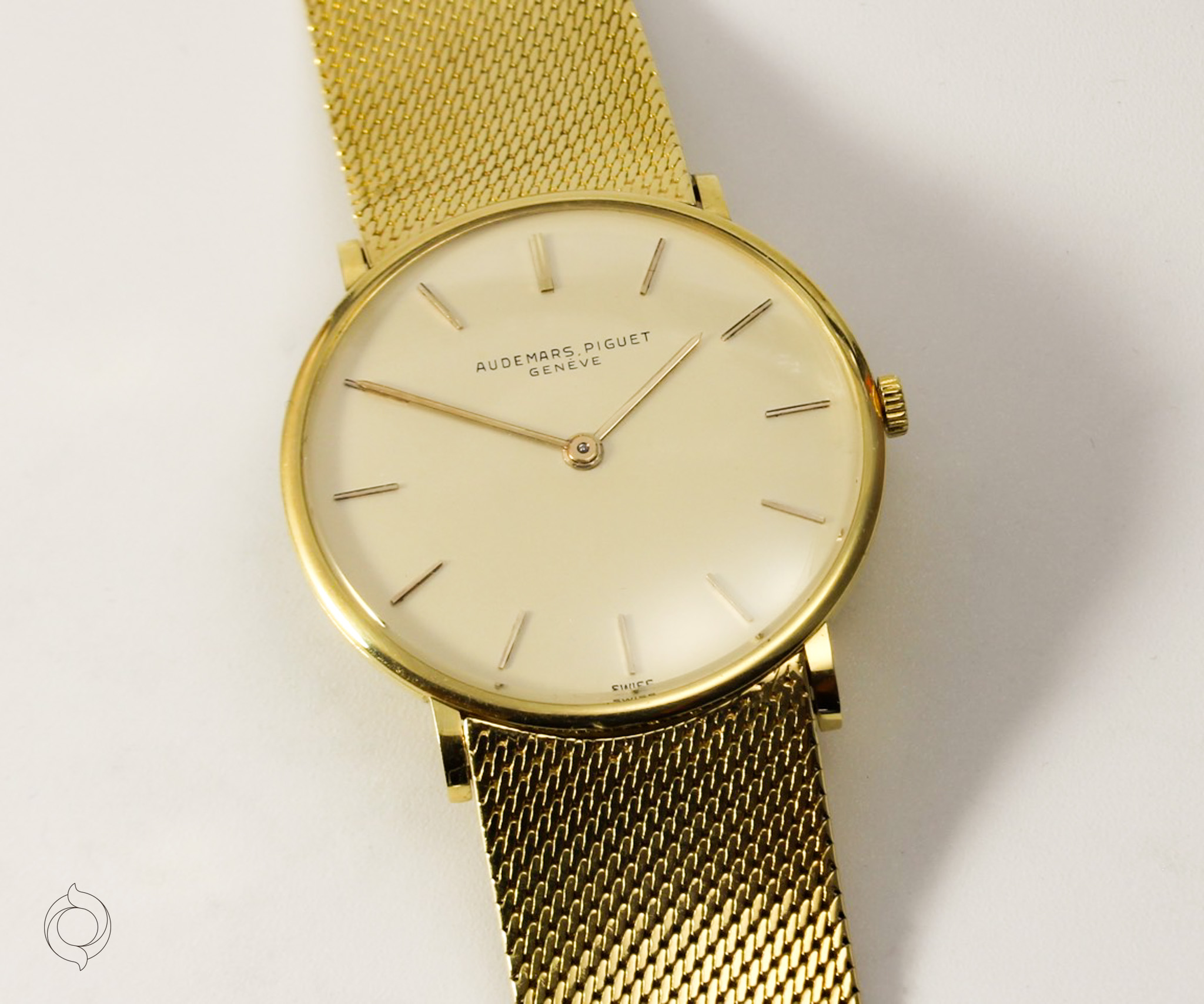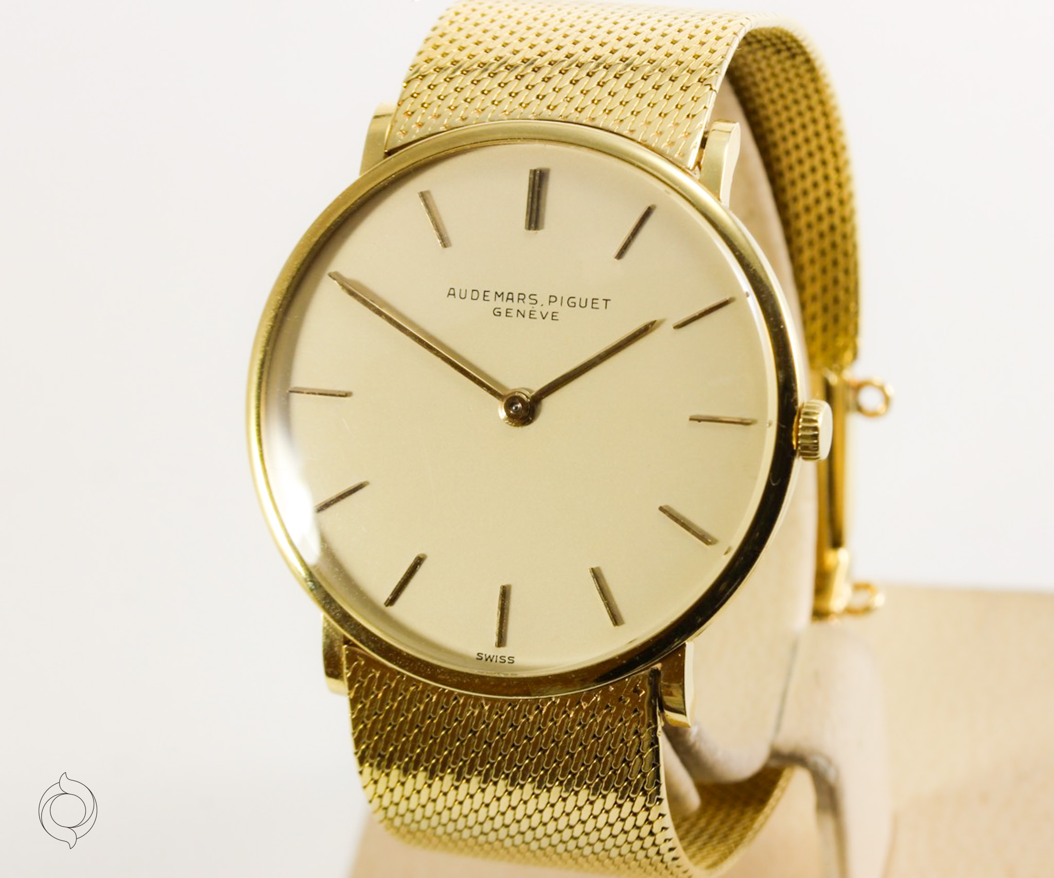 Seltene, exklusive AUDEMARS PIGUET Anzuguhr extra schmales 18K Gold Gehäuse, Goldpunze an Gehäuserand und Faltschließe, Gewicht 53 g, Handaufzug Kaliber 2003, Herstellung ca. 1967, Umfang 16 cm, unbehandelt original exzellent erhalten! Zifferblatt, Gehäuse, Werk und 18K Goldband mit Faltschließe sind AUDEMARS PIGUET signiert Zubehör: GARANTIEKARTE, SCHÖNE SAMMLERUHREN Echtheitszertifikat, Dokumentation und SCHÖNE SAMMLERUHREN Uhrenbox