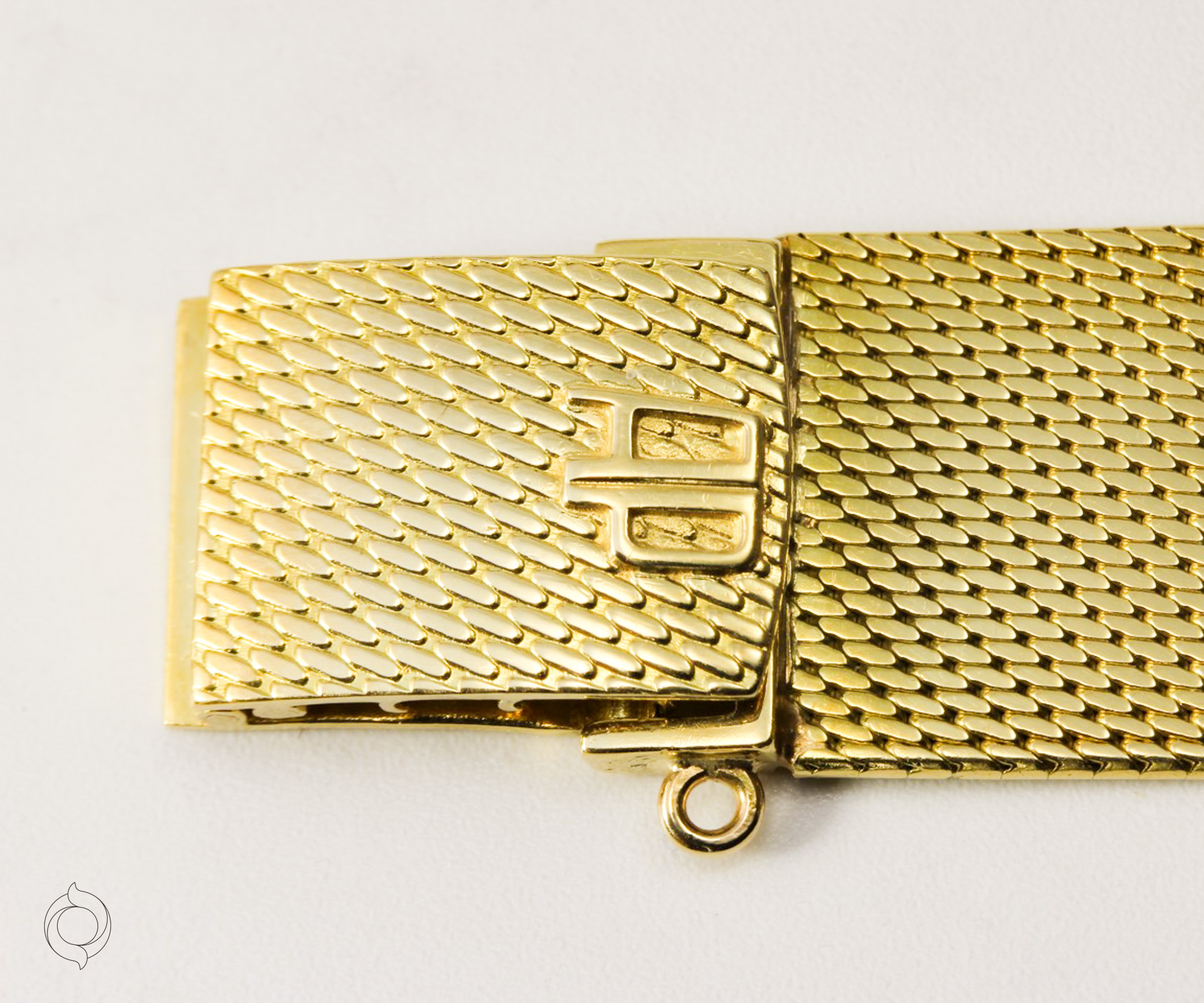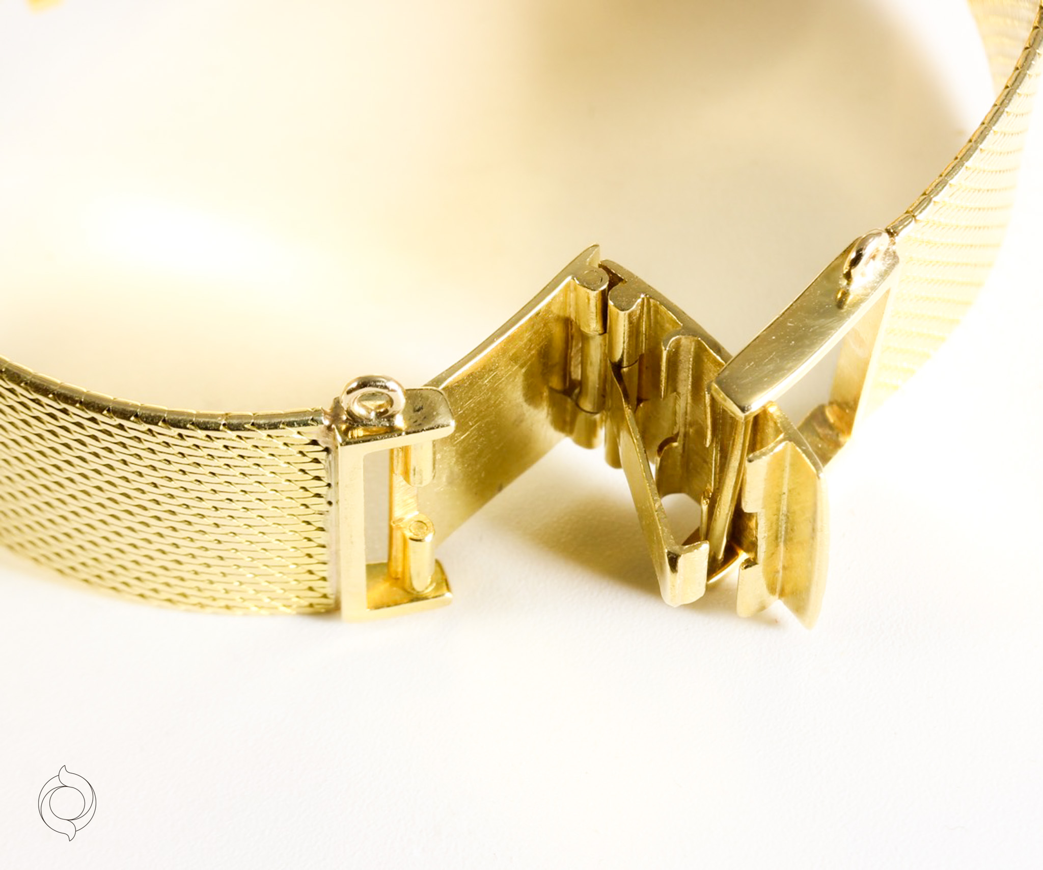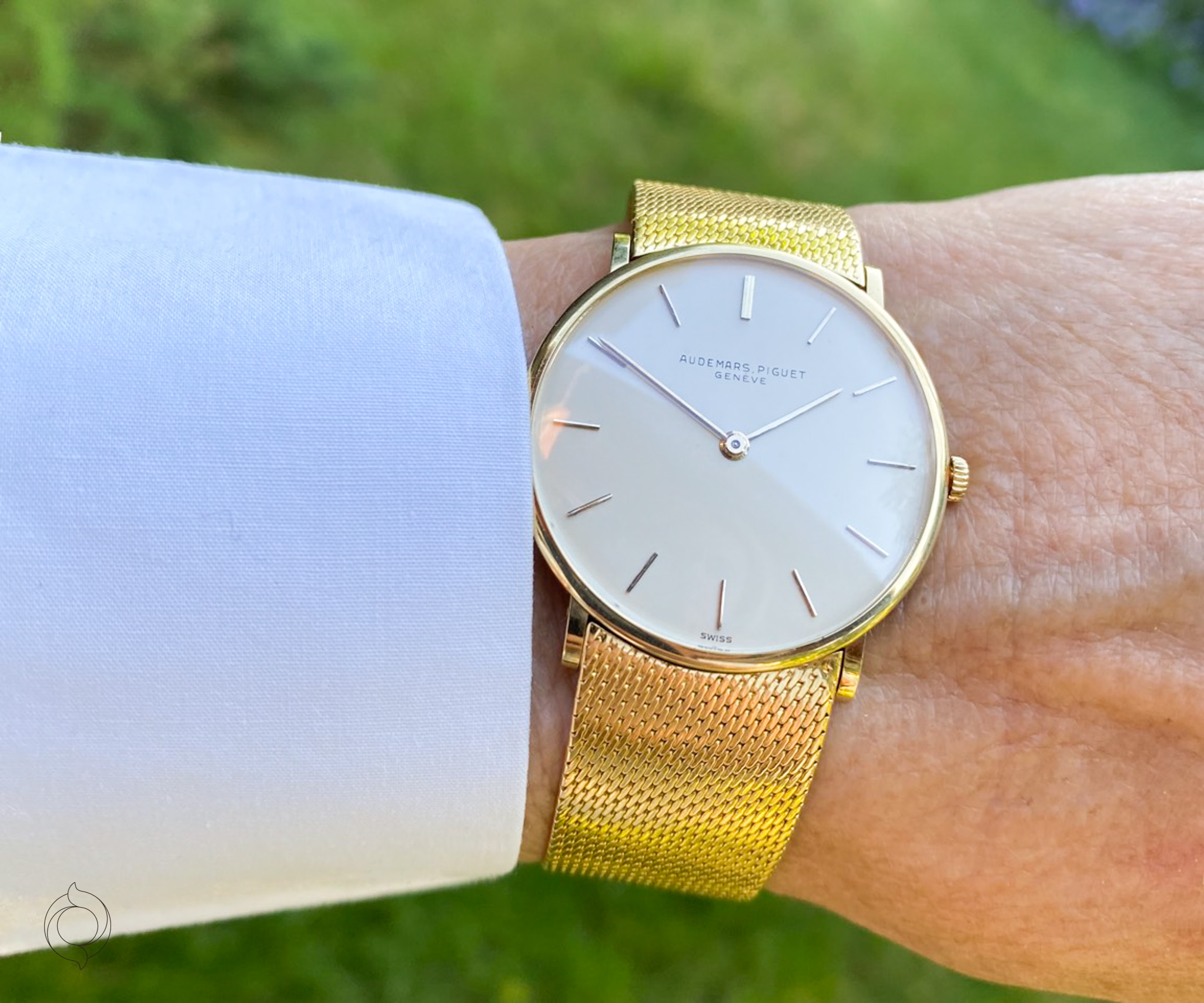 Seltene, exklusive AUDEMARS PIGUET Anzuguhr extra schmales 18K Gold Gehäuse, Goldpunze an Gehäuserand und Faltschließe, Gewicht 53 g, Handaufzug Kaliber 2003, Herstellung ca. 1967, Umfang 16 cm, unbehandelt original exzellent erhalten! Zifferblatt, Gehäuse, Werk und 18K Goldband mit Faltschließe sind AUDEMARS PIGUET signiert Zubehör: GARANTIEKARTE, SCHÖNE SAMMLERUHREN Echtheitszertifikat, Dokumentation und SCHÖNE SAMMLERUHREN Uhrenbox