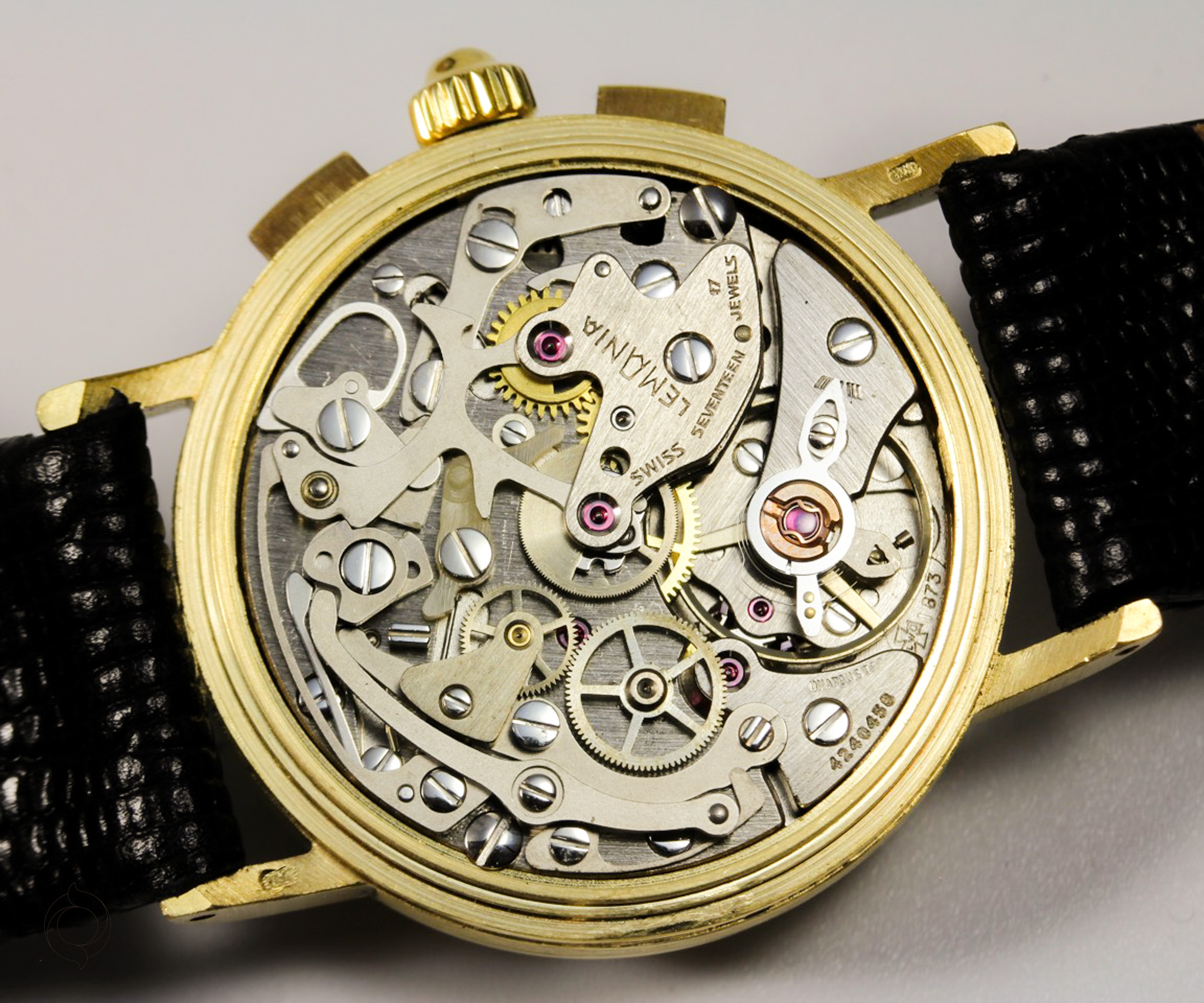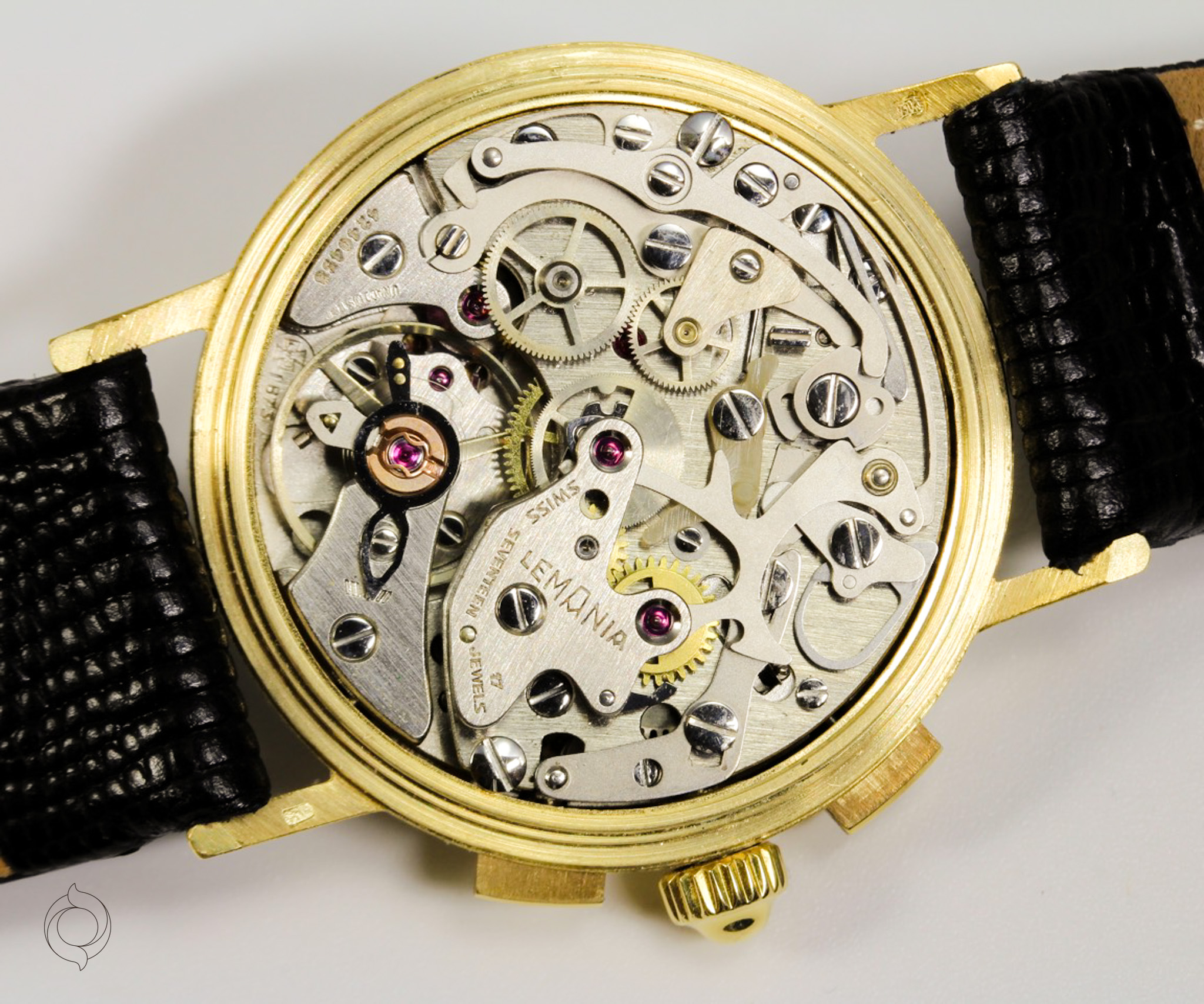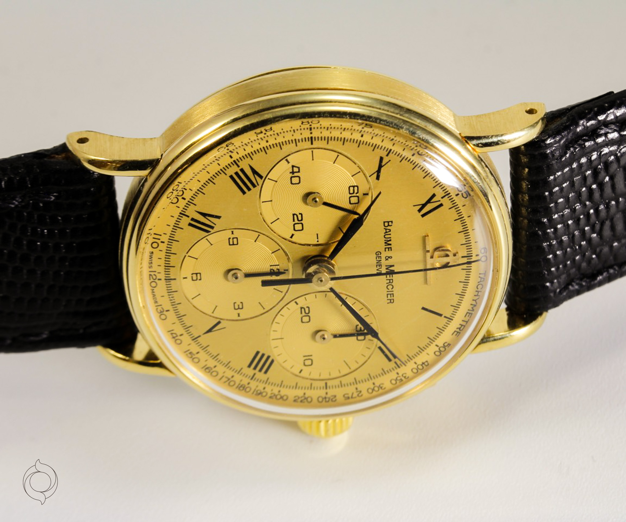 Unbehandelt original golden, römische Stundenzahlen, aufgelegtes Logo, Federzeiger, Tachymeter, Minuterie, 30-Sekunden-Zähler, 12-Stunden-Zähler, kleine Sekunde