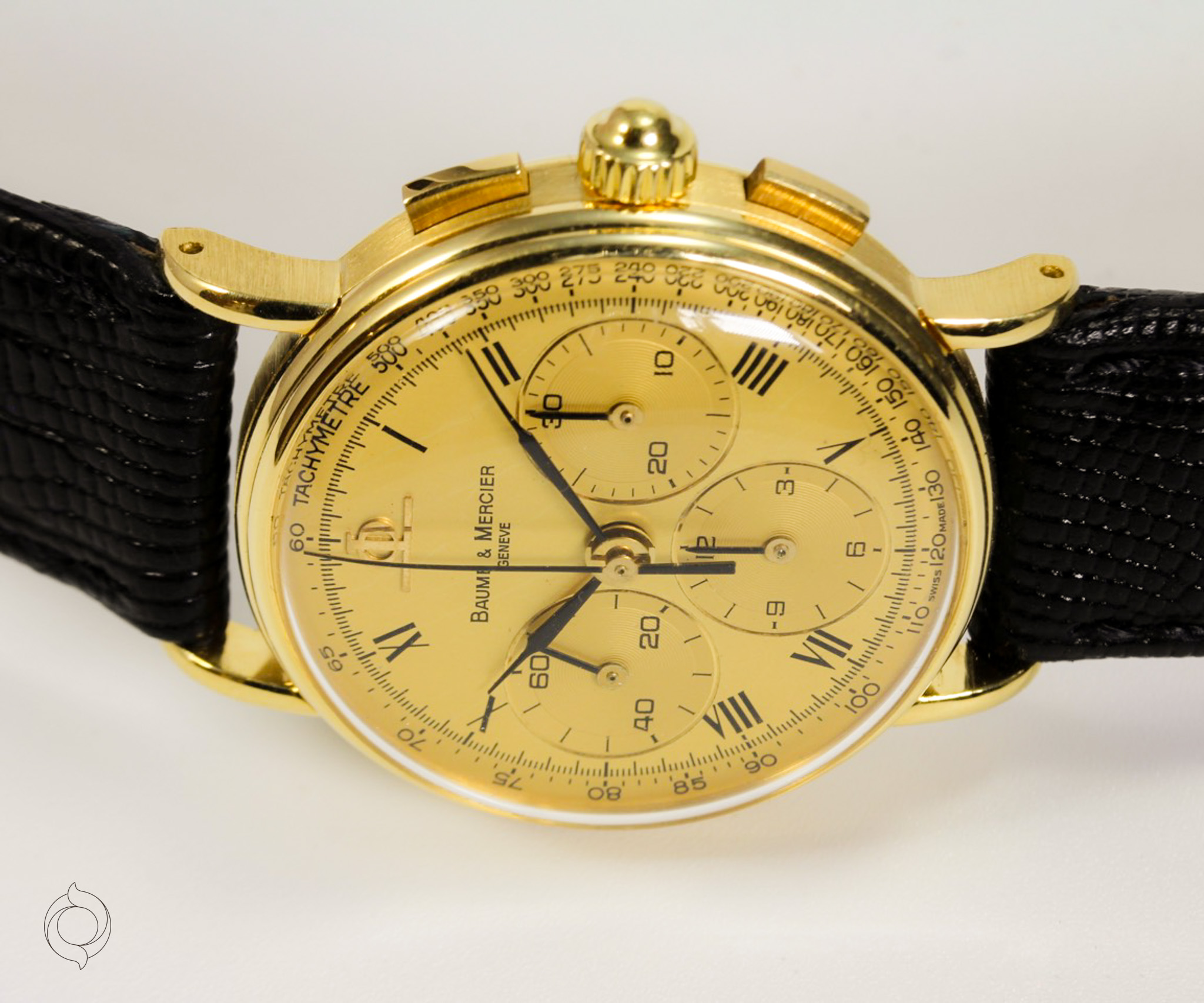 Sehr attraktiver BAUME MERCIER Chronograph Tri-Compax 18K Gold Gehäuse, Goldpunzen an den Bandanstößen, Gewicht 19 g netto, Lemania Kaliber 1873, Referenz 1830, Zifferblatt mit römischen Zahlen und 3 Registern, Herstellung ca. 1980, unbehandelt original exzellent erhalten! Zifferblatt, Gehäuse und Werk sind BAUME MERCIER signiert Zubehör: GARANTIEKARTE, SCHÖNE SAMMLERUHREN Echtheitszertifikat, Dokumentation und SCHÖNE SAMMLERUHREN Uhrenbox