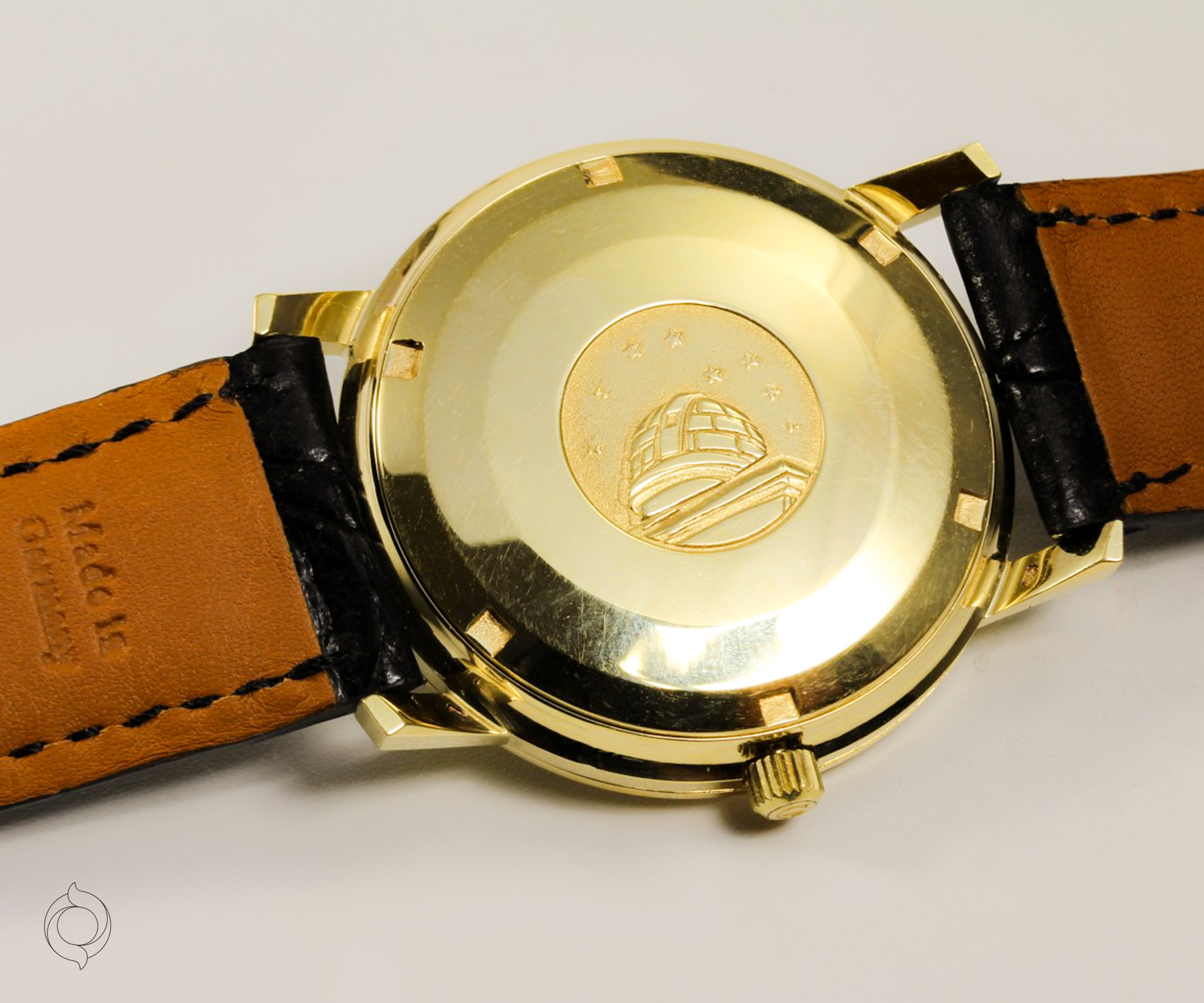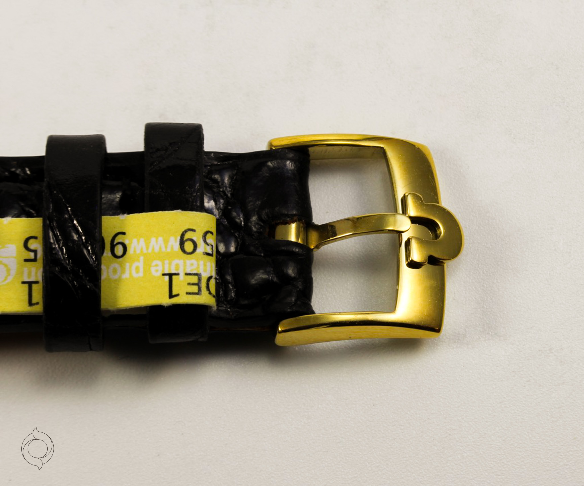 Schwarzes Kroko-Lederband mit vergoldeter OMEGA Dornschließe (Die Uhr kann mit einem anderen oder zusätzlichem Armband geliefert werden)