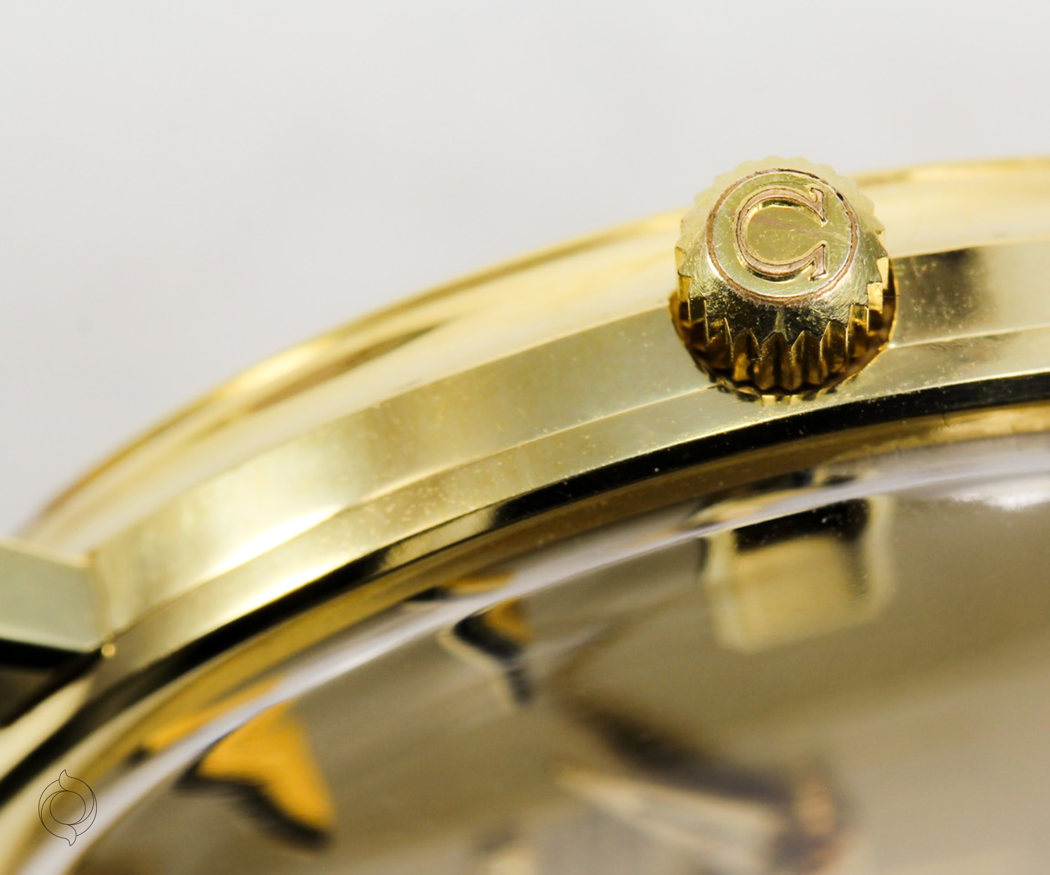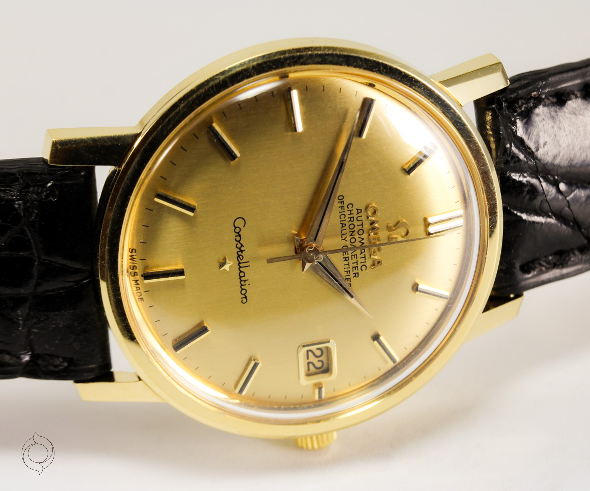 Unbehandelt original 18K Gold, aufgelegte Indexe mit Onyx und Omega Logo, Dauphine Zeiger mit Onyx, Minuterie, Datum, Zentralsekunde