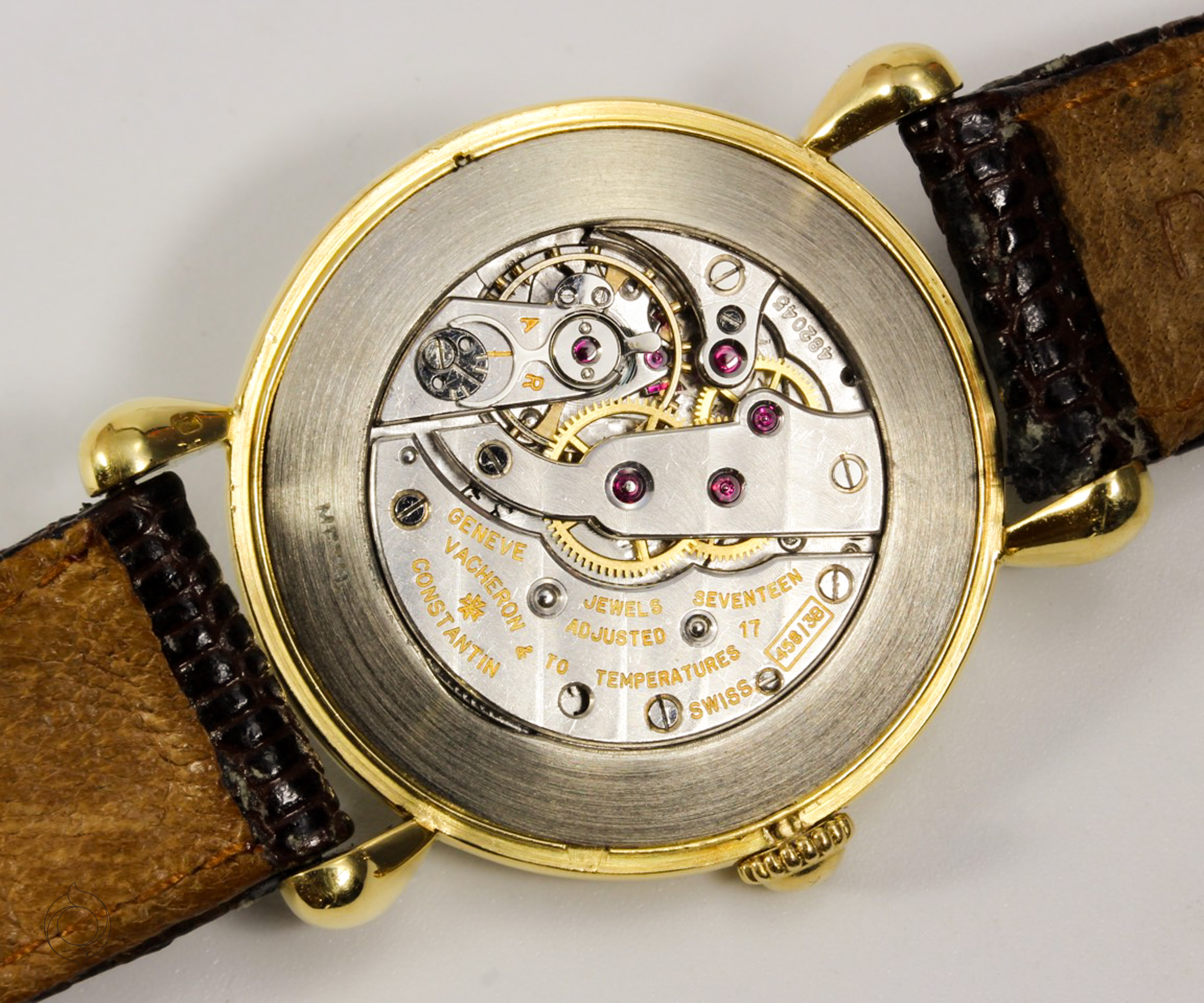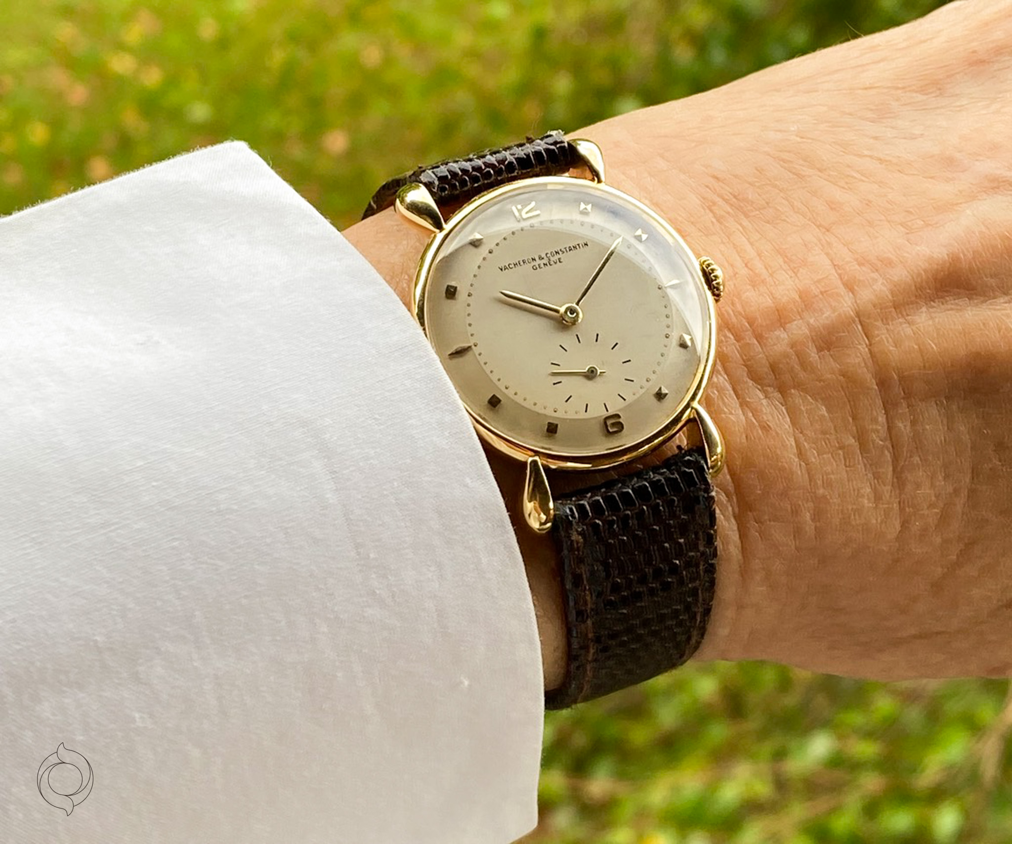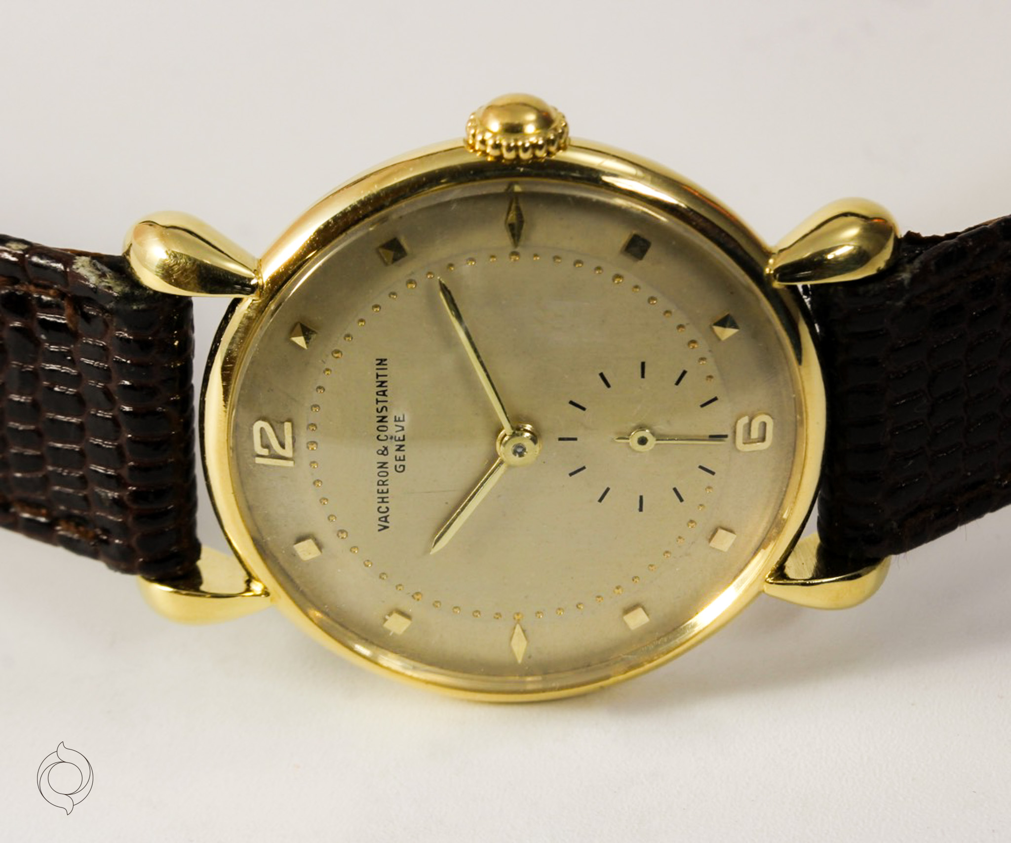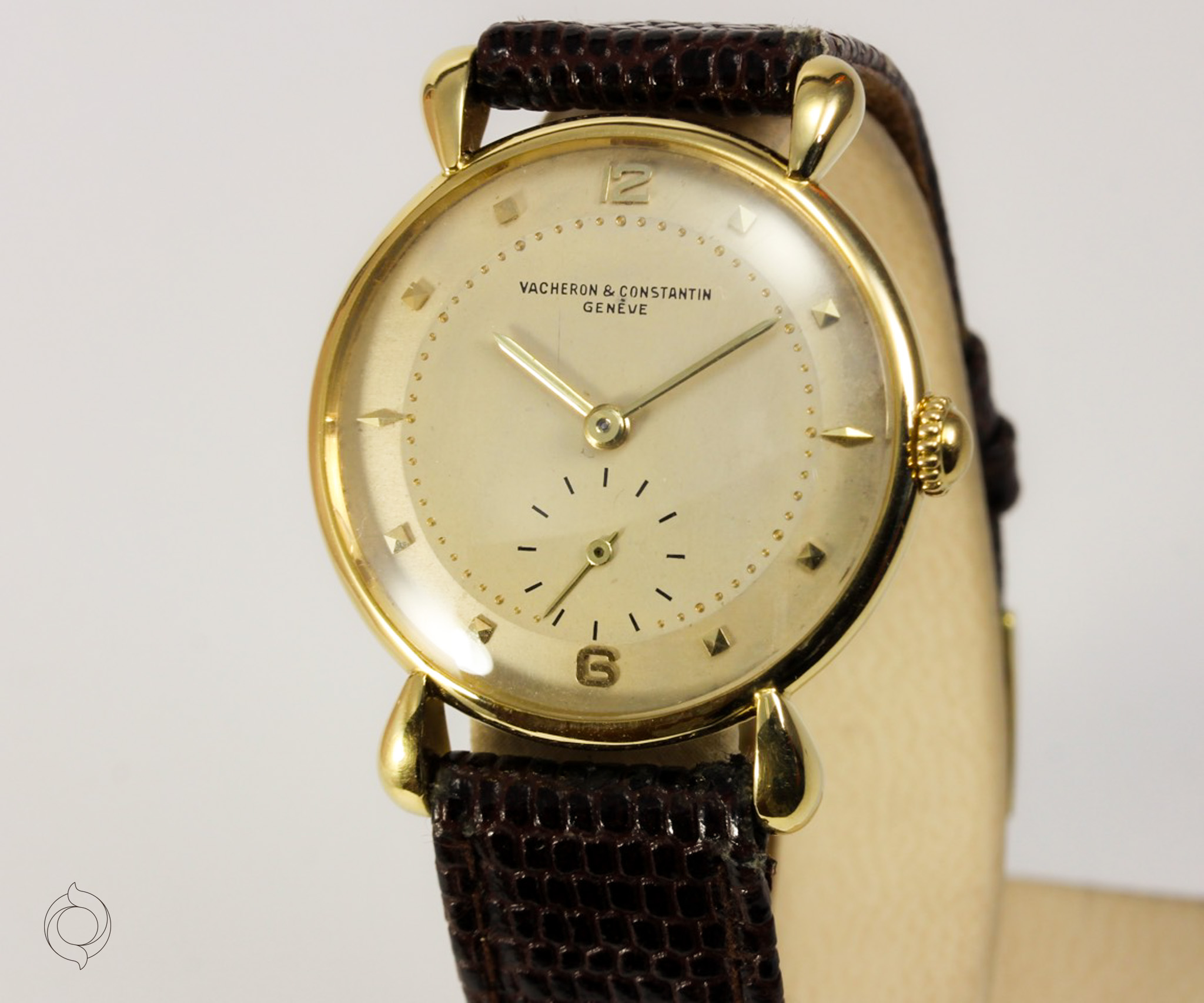 Seltene VACHERON CONSTANTIN Anzuguhr 18K Gold Gehäuse mit tropfenförmigen Bandanstößen, Goldpunze am Bandanstoß, Gewicht 27,5 g, Kal. 458/ 3B, Herstellung ca. 1948, unbehandelt original sehr gut erhalten, mit vergoldeter VACHERON CONSTANTIN Dornschließe! Zifferblatt, Gehäuse, Werk und Schließe sind VACHERON CONSTANTIN signiert Zubehör: GARANTIEKARTE, SCHÖNE SAMMLERUHREN Echtheitszertifikat, Dokumentation und SCHÖNE SAMMLERUHREN Uhrenbox